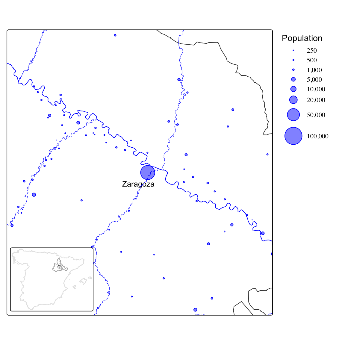 We will rely on census data for the province of Zaragoza (Spain) in 1860. The data set we will work with contains the individual records for all the population living in the 70 municipalities within 40 kilometers from the capital city of Zaragoza (see map below).1 You can download the data here (Beltrán Tapia and Marco-Gracia 2024).